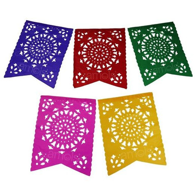 Our Large Sol Paper Picado Flag Banner is the perfect way to brighten up your Fiesta or Cinco de Mayo party. This colorful tissue banner features 10 flags with a hand cut traditional sun design. Hang this indoors and celebrate in style with a festive and authentic Mexican banner.