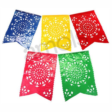 Our Large Sol Plastic Picado Flag Banner is the perfect way to brighten up your Fiesta or Cinco de Mayo party. This colorful plastic banner features 10 flags with a hand cut traditional sun design. Hang this indoors or outdoors, and celebrate in style with a festive and authentic Mexican banner.