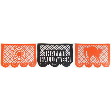 Our Happy Halloween Large Plastic Picado Banner is the perfect hanging decoration for your Halloween party. Each banner has alternating black and orange plastic panels with fun, assorted cut-out Halloween designs. Your guests will love this unique decoration.
