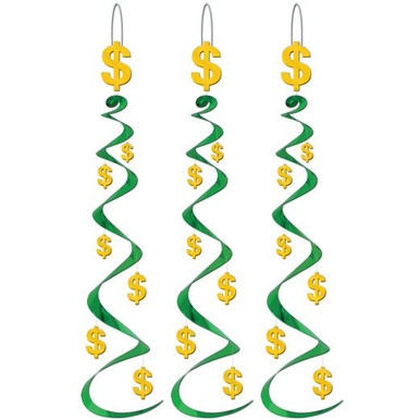 Our Dollar Sign Whirls will add a sparkle to your casino party. These dollar sign whirls are the perfect hanging decoration.