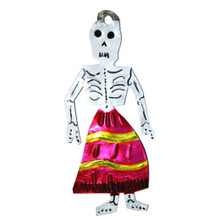 Our Dama with Skirt Tin Ornament is a unique touch for Day of the Dead, or any other Mexican-inspired celebration! This ornament is hand-crafted and painted in assorted colors, making it an authentic decoration or party favor. Your guests will love our Dama w/ Skirt Tin Ornament.