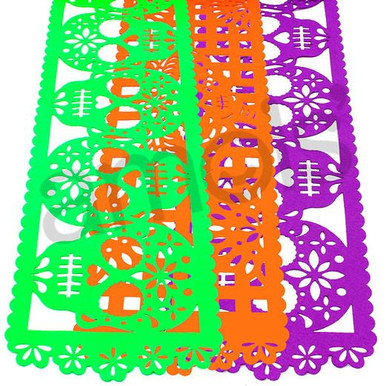 Our Day of the Dead Felt Table Runner is a beautiful decoration that is also very versatile. In addition to using it to dress up a party table or dining table, it can be used as a hanging decoration you can place on doors and walls. It is also makes the perfect addition to your Dia de los Muertos altar. Each sash contains an intricate traditional cut-out design.