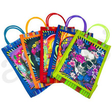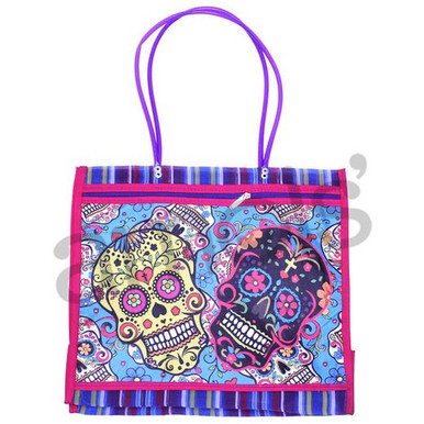 Our colorful Skull Mesh Bag is a Mexican shopping bag, or bolso, that is a great party favor or treat sack for your Fiesta, Day of the Dead, or Cinco de Mayo celebration! Each bag is imprinted with traditionally designed Day of the Dead Skulls. Each bag is made out of woven nylon fibers which create a mesh texture.