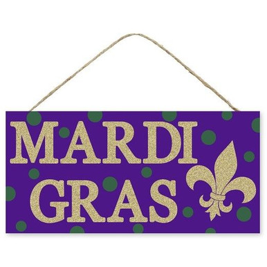 Bring a taste of New Orleans' claim to fame to your home with this vivacious Mardi Gras sign! Featuring a detailed purple and green polka-dot background, along with glitter-gold fleur de lis, this sign will give your guests quite the welcome! Display this sign by the front entrance to make an immediate impression; you may also decorate this sign with some ribbon and beads!