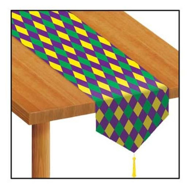 Our Mardi Gras Table Runner will add a festive look to your Mardi Gras party tables. Lay it across your entertainment table for an accented look.