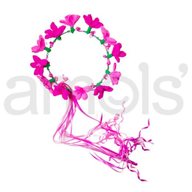 Our Hot Pink and Pink Flower Crown is a great favor or costume accessory for a Fiesta party or Cinco de Mayo celebration. This hand-made crown is decorated with our terecitas flowers and has a colorful curled ribbon tail. This flower crown can also be used as a small wreath to decorate your Fiesta party.