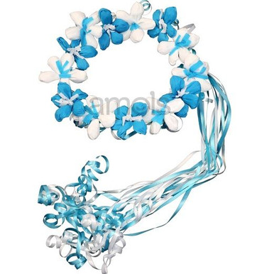Our Turquoise and White Flower Crown is a great favor or costume accessory for a Fiesta party or Cinco de Mayo celebration. This hand-made crown is decorated with our terecitas flowers and has a colorful curled ribbon tail. These flower crowns also can also be used as small wreaths to decorate your Fiesta.