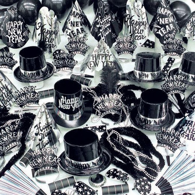 Our Black and Silver Party Kit for 100 people is the classiest way to ring in the New Year. This kit is perfect for larger New Years Eve parties and is sure to make all your friends want to celebrate the New Year in style.
