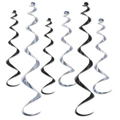 Our Black and Silver Twirly Whirlys are excellent hanging decorations for any party or event. With their metallic foil finish, they are certain to make your party sparkle. Amols' party experts recommend these for New Year's Eve, Awards Night and Hollywood galas, and anniversary parties.