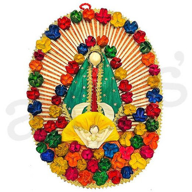 Our Cornhusk Virgen Wall Decor is crafted by hand by our skilled artisans in Mexico. This wall plaque is made out of a straw backing with gold trim and includes the Virgen de Guadalupe and an angel made out of dyed cornhusks. Surrounding these figures are brightly colored seeds that are hand dyed and split into beautiful flowers.