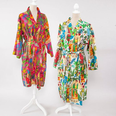 The kimono you have needed is finally here. This colorful and luxurious kimono has Frida printed on it with various fun and colorful designs and patterns. Wear these around the house or gift them as a year-round present. Thes kimonos come in multiple designs, so contact the store at 210-227-1457 or sales@amols.com to ensure you get the design you like.
